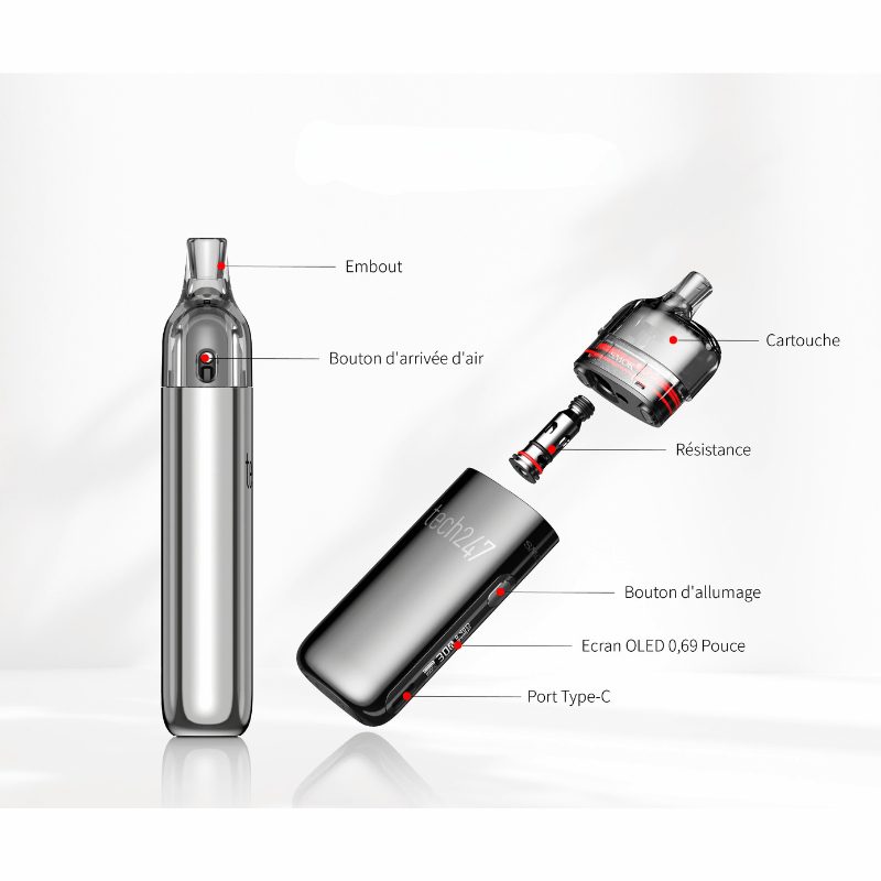 Le pod est livré avec deux drip tips et deux résistances, pour alterner facilement entre MTL (tirage serré) et RDL (semi-aérien) selon l’envie du moment.